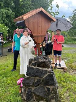 Der neue Meilenstein in der Geschichte der Marienkapelle Caan ist gesetzt, das Wegkreuz in der Gemarkung Schäfersgarten eingesegnet. Während noch am Morgen des 26. Mai die Sonne vom Himmel strahlte, schienen Petrus, Clemens und Frau Holle im Laufe des Tages eine Pause einzulegen.