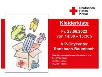 Am 23. Juni 2023 haben wir in der Zeit von 14:00 - 15:30 Uhr wieder für Sie geöffnet. Unsere Kleiderkiste befindet sich im VIP-Citycenter (Rheinstraße 96, Einfahrt VIP 2, Haus G Tor 1, neben der Ausgabestelle der Tafel) in Ransbach-Baumbach.