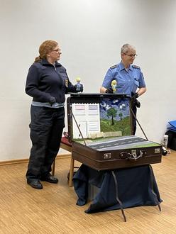 Einer der Polizeibeamtinnen hatte eine „Straße“ (Klebeband) in ihrer Hosentasche mitgebracht, die sie für uns auf dem Boden darstellte. Jeder durfte mit Hilfe der Polizistin die Straße überqueren. Besonders gut ist der Spruch „Nicht rennen- nicht pennen- zügig gehen!“ den Vorschulkindern in Erinnerung geblieben.