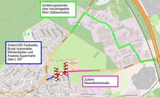 Der Verkehr aus Richtung Ebernhahn in Richtung Stadtmitte Ransbach-Baumbach wird über die Sälzerstraße / Industriegebiet Rohr auf die Landesstraße 307 umgeleitet. Die Zufahrt zur Masselbachstraße ist bis auf wenige Ausnahmen gewährleistet. Die ED Tankstelle, die Mühlenbäcker und der Anatolia Supermarkt sind über die L 307 aus Richtung Stadtmitte jederzeit erreichbar.