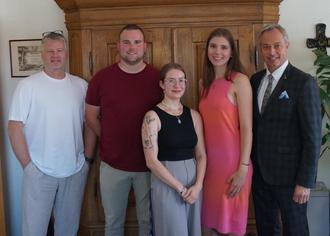 Gleich drei Nachwuchskräfte absolvierten im Juni 2025 erfolgreich ihre sogenannten Laufbahnprüfungen an der Zentralen Verwaltungsschule für Rheinland-Pfalz in Mayen. Mit Jasmin Koyro (Mitte), Shalin Ruster (2.v.re.) und Jonas Knopf (2.v.li.) wurden alle drei „ehemalige“ Auszubildende dann auch zum 01. Juli 2025 als neue Mitarbeiter übernommen und ihren künftigen Sachgebieten zugewiesen. So unterstützt Jonas Knopf in Zukunft als Sachbearbeiter das Einwohnermeldeamt, Jasmin Koyro das Ordnungsamt und Shalin Ruster das Personalamt.