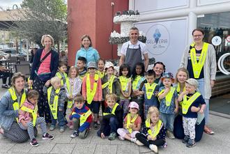 Die Bärengruppe der Kindertagesstätte St. Antonius besuchten am 27.06.2023 das Eiscafé Marco am Marktplatz in Ransbach-Baumbach.