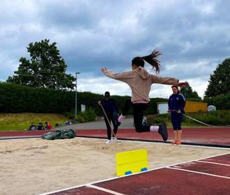 Am 05.07.23 fand das diesjährige Sportfest unserer Schule auf dem Sportplatz in Ransbach statt. Organisiert wurde es von der Fachleitung Sport und dem Sportkollegium. Insgesamt gab es fünf Disziplinen, die sich an den Anforderungen des Deutschen Sportabzeichens orientierten. Die Kinder der dritten und vierten Klassen nahmen gemeinsam an verschiedenen Herausforderungen wie 30/50 m Sprint, (Zonen-) Weitsprung, Schlagball Weitwurf, Standweitsprung und Seilspringen teil. Die Stimmung war trotz des stürmischen Wetters entspannt und fröhlich, begleitet von passender Musik zum Aufwärmen, die die Teilnehmer anfeuerte und motivierte. Es war insgesamt eine großartige Gelegenheit für die Schülerinnen und Schüler, ihre sportlichen Fähigkeiten zu zeigen und ihre Freunde am Sport anzufeuern. Die Atmosphäre war geprägt von Freundschaft und Zusammenhalt. Die Teams der beiden Klassenstufen lieferten sich am Ende noch ein stufeninternes Ballstaffel Wettrennen, begleitet und lautstarken Aufeuerungsrufen aller Kinder. Am Ende konnten die Klassen 3c und 4b den Sieg holen.