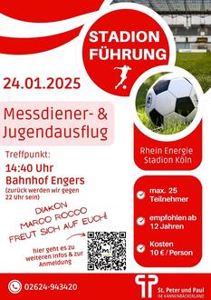 Freitag, 24. Januar 2025, 14:30 Uhr, Messdiener- und Jugendausflug Stadion Köln