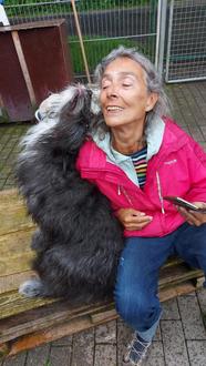 Foto: Scooby verteilt freudig Küsschen an eine sein Personal; Tierheim Ransbach-Baumbach.