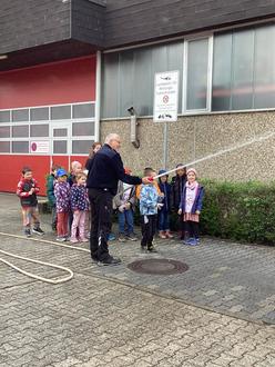 Am 15. Mai 2023 haben die diesjährigen Vorschulkinder von der Kita „Haus der kleinen Füße“, die Feuerwehrwache Ransbach-Baumbach besucht. Dort hat der Wehrführer Olaf Faller den „Lustigen Eulen“ die Notrufzentrale gezeigt. Anschließend wurde erklärt, was ein Feuerwehrmann/eine Feuerwehrfrau alles an Ausrüstung haben und welche Aufgaben sie erfüllen müssen. In der Fahrzeughalle angekommen, durften sich die Kinder jedes Auto einmal näher anschauen und sich in einige reinsetzen. Zum Abschluss hatten die Kinder die Möglichkeit einmal Feuerwehr zu spielen und mit dem Feuerwehrschlauch zu spritzen.