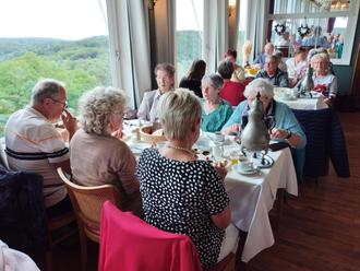 Unser zweites Ziel war Solingen-Burg. Durch den Torbogen „Schloß Burg“ führte uns der Weg zum „Gasthof zur Schönen Aussicht“, wo wir zu einer „Bergische Kaffeetafel“ erwartet wurden. Die Tische waren reichlich gedeckt. Ein kulinarisches herzhaftes Erlebnis, das typisch für die Region Bergische Land ist, durften wir bei schöner Aussicht genießen. Eine original Krankanne „Dröppelminna“, spendete uns den Kaffee.