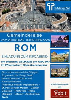 Eine Busfahrkarte (Hin und Zurück 12 €) kann zusammen mit der Anmeldung bis zum 22.08. erworben werden: in Hillscheid bei Maria Petmecky und nach den Gottesdiensten am 03.08. und 17.08. in Nauort und am 09.08. und 24.08. in Stromberg sowie im Pfarrbüro Nauort am Fr, 22.08.2025 sowie im Zentralen Pfarrbüro, Anmeldungen bitte bis zum 27.08.2025; Infos: für die Kirchorte Höhr-Grenzhausen/Hillscheid: Maria Petmecky Tel.02624-2965, Dorothee Dörschel / für die Kirchorte Nauort/Stromberg: Sonja Perk Tel.0177-3780949