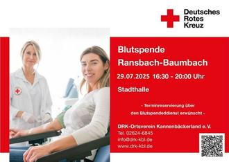 Ihr Blut wird dringend gebraucht! Der DRK Ortsverein Kannenbäckerland möchte Sie zur nächsten Blutspende herzlich einladen. Die kommende Blutspende findet am Dienstag, den 29.07.2025 in der Zeit von 16.30h -20.00h in der Stadthalle in Ransbach-Baumbach statt.