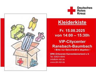 Am 15.08.2025 haben wir in der Zeit von 14:00 – 15:30 Uhr wieder für Sie geöffnet. Unsere Kleiderkiste befindet sich im VIP-Citycenter (Rheinstraße 96, Einfahrt VIP 2, Haus G Tor 1, neben der Ausgabestelle der Tafel) in Ransbach-Baumbach.
