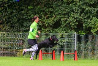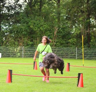 Als Erste startete Lotta Nengelken (Jugend) mit amerik. Collie-Großpudelmix „Leo“ beim 2 km Geländelauf und setzte sich mit Bestzeit von 12:01min. selbst von den Erwachsenen ab. Im Vierkampf (VK), Leistungsklasse (LK) 1 wechselte N. Nengelken zu Bordercollie – Großpudelmix „Loki“. Die Unterordnung verlief zu Beginn eher schleppend. Loki hing leicht hinten dran und machte einen ramdösigen Eindruck. Dafür gab es 48 Punkte. Das änderte sich schlagartig in der 2. Disziplin Hürdenlauf. Da musste Loki ausgebremst werden, damit er nicht die 60m Hürden ohne Frauchen durchflitzt. Sie musste ja mit über die Hürden. In der 3. Disziplin Slalom beging L. Nengelken den Fehler die 1. Runde mit einer neuen Technik zu führen. Diese vorher nicht im Training ausprobiert, verursachte 8 Fehlerpunkte. In der 2. Runde hörte sie auf die Trainer, zog die alte Technik durch und es funktionierte. Die 4. Disziplin Hindernislauf liefen die Zwei beide Runden ohne Zwischenfälle perfekt. Mit 223 Punkten in der Gesamtwertung nur knapp an der Qualifikation für die LK 2 vorbei. Ärgerlich, wenn man bedenkt, dass Fehlerpunkte auf den Versuch beim Slalom gingen. Trotzdem Platz 1 im VK 1 (Jugend).