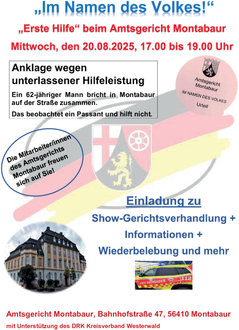 „Durchdrücken“ ist das Motto der Show-Gerichtsverhandlung und Erste-Hilfe-Übungen im Amtsgericht Montabaur am Mittwochnachmittag, den 20.08.2025 zwischen 17.00 und 19.00 Uhr.