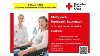 Ihr Blut wird dringend gebraucht! Der DRK Ortsverein Kannenbäckerland möchte Sie zur nächsten Blutspende herzlich einladen. Die kommende Blutspende findet am Dienstag, 6. September 2022 in der Zeit von 16.30h -20.00h in der Stadthalle in Ransbach-Baumbach statt. Bitte beachten Sie, dass der DRK Blutspendedienst-West das bestehende Hygiene- und Sicherheitskonzept stetig der aktuellen Lage anpasst. Die Verpflichtung zum Tragen einer medizinischen Maske bleibt weiterhin bestehen. Kindern und Begleitpersonen ist ab sofort der Zutritt zum Spendelokal wieder gestattet.