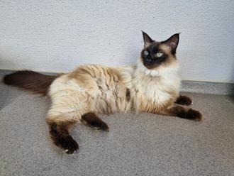Der freundliche Ragdoll/ Heilige Birma Mix ist aufgeschlossen, verschmust und neugierig. Er liebt uns Menschen sehr und möchte sich in Zukunft kein Sofa mehr mit einem Artgenossen teilen müssen.