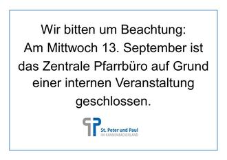 Berichte und Ankündigungen für das Verbandsgemeindeblatt KW 38, Erscheinungszeitraum 23.09. - 01.10.2023 bitte bis spätestens Montag 11.09.2023 einreichen. Messbestellungen und Veröffentlichungswünsche für das Pfarrblatt für Oktober müssen bis spätestens Donnerstag, 21.09.2022 im Zentralen Pfarrbüro angegeben werden.