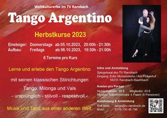 Beim TV Ransbach finden wieder Tango Argentino-Kurse statt. Lerne und erlebe den Tango Argentino mit seinen klassischen Stilrichtungen Tango, Milonga und Vals - ursprünglich - stilvoll - respektvoll - Musik und Tanz aus einer anderen Welt.