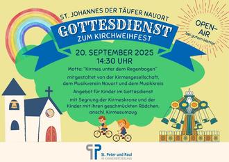 Am Sa, 20.09.2025 feiern wir den Kirmesgottesdienst um 14:30 Uhr. Bei gutem Wetter findet er Open-Air an der Kirche statt. Diesmal heißt das Motto: „Kirmes unter dem Regenbogen.“ Der Musikverein Nauort und der Musikkreis werden uns in diesem Jahr musikalisch begleiten. Auch die Kirmesgesellschaft wirkt wieder mit. Zu dem Gottesdienst wird es ein Angebot für Kinder geben. Die Kinder mit ihren mitgebrachten geschmückten Fahrrädern werden am Ende des Gottesdienstes zum Segen eingeladen und können unter einem Regenbogen hindurchfahren! Nach dem Segnen der Kirmesglocke startet der Umzug durch den Ort, der auf dem Kirmesplatz endet.