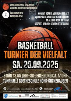 Basketball als Brücke zwischen Menschen: Unter diesem Gedanken laden die Sportfreunde Höhr-Grenzhausen e.V. zum „Turnier der Vielfalt“ in die Turnhalle der Goetheschule ein. Unterstützt durch das Bundesprogramm „Demokratie leben!“ entsteht ein Begegnungsraum, in dem Fairplay, Offenheit und Miteinander im Mittelpunkt stehen – ganz unabhängig von Alter, Herkunft oder Vorerfahrung.