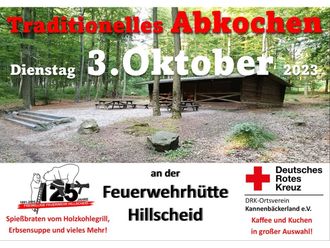 Am Montag, 03.10.2022 ab 11.00h findet das traditionelle Waldfest zum 03. Oktober an der Feuerwehrhütte in Hillscheid statt. Die Freiwillige Feuerwehr Hillscheid und der DRK Ortsverein Kannenbäckerland laden alle herzlich ein, um ein paar gemütlich Stunden an der Hütte zu verbringen.