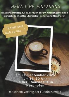 | 14.30 Uhr | „Komm setz dich zu uns“ ein Frauennachmittag mit einem Vortrag der Fürstin zu Wied in der Pfauenhalle Nordhofen |