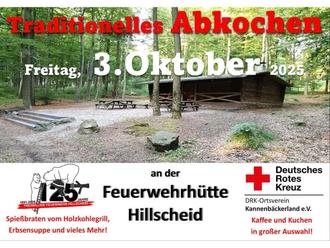 Am Freitag, 03.10.2025 ab 11.00 h findet das traditionelle Waldfest zum 3. Oktober an der Feuerwehrhütte in Hillscheid statt. Die Freiwillige Feuerwehr Hillscheid und der DRK Ortsverein Kannenbäckerland laden alle herzlich ein, um ein paar gemütliche Stunden an der Hütte zu verbringen.