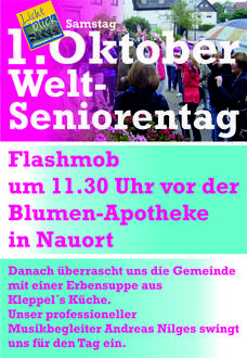 Nach der langen Corona Auszeit wollen wir am Aktionstag wieder dabei sein. Alle Nauorter Senioren, die zeigen wollen, dass man auch im Alter voller Lebenslust steckt, sind eingeladen. Los geht’s am Samstag, den 1.10.22, um 11.30 Uhr vor unserer Apotheke. Michael Grote überlässt uns seinen Vorplatz für einen gemeinsamen Senioren-Flashmob