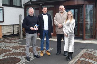 Das Foto zeigt Christian Einig (2.v.li.) vom Bildungswerk der Hessischen Wirtschaft e. V. beim Besuch des Rathauses in Ransbach-Baumbach, neben Büroleiter André Heuser (li.), dem SBV der Verwaltung in Person von Ruwen Herbel (2.v.re), sowie Anna Dietrich, der Ausbildungsbeauftragten des Hauses.
