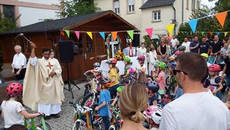 Eine lebendige Kirche aus Kindern, die ein Dach aus ihren Armen formten hinter einem Kirchturm gefertigt aus einer „umgedrehten“ bemalten Schultüte - ein Eindruck aus dem Kinderwortgottesdienst zum Kirchweihfest mit dem Thema „Bei Gott zu hause.“ Anschließend wurden die teilnehmenden Familien Teil des Openair-Gottesdienstes mit allen Gottesdienstbesuchern neben der Kirche Sankt Johannes der Täufer, die im Jahr 1955 erbaut wurde und nun erneut „Geburtstag feierte“.