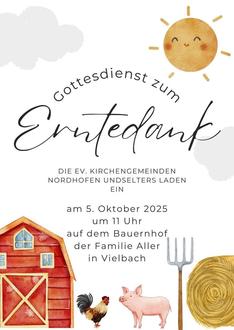| 11.00 Uhr | gemeinsamer Erntedankgottesdienst der Kirchengemeinden Nordhofen & Selters auf dem Bauernhof Aller in Vielbach |