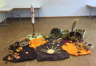 Hierzu wurden Lieder und Gedichte eingeübt und für den Erntetanz Obst- und Gemüse - Stirnbänder gebastelt. Das Pfarrheim wurde mit Obst und Gemüsegaben zuvor reichlich geschmückt.