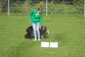 Ronja Nengelken (Jungend (J)) startete mit Bordercollie-Großpudelmix „Loki“ in Klasse I. Vom Start weg lief das Team sicher und zielstrebig den Parcours ab. Bei der Übung „Vorsitz & einen Schritt zur Seite“ war Loki diesmal perfekt dabei. Auch „rechts gehen“ klappte einwandfrei. Zum Ende des Parcours wurde Loki von einer Mücke, Biene oder ähnlichem aus dem Konzept gebracht und musste sich kratzen. Frauchen ließ sich nicht aus der Ruhe bringen und schaffte es, den abgelenkten Loki wieder in die Konzentration zu bringen. Auch die Regionalbahn, die im Bereich des Vereinsgelände zwecks unbeschranktem Bahnübergang mit reichlich lautstarkem hupen den Parcours untermalte, machte den Zweien herzlich wenig aus. Auch so etwas ist ein Anreiz gelegentlich auf auswärtigem Gelände zu trainieren, um andere Umweltreize für Hund und Halter routinierter werden zu lassen. Insgesamt 75 Punkte („gut“) vergab die Prüfungsrichterin dafür, was Platz 1 in der Jugend bescherte.