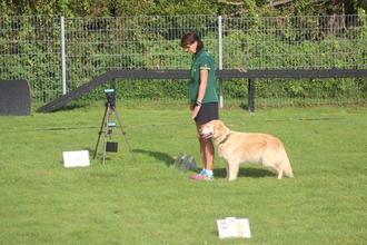 Bei Silke Pook-Sesterhenn mit Golden Retriever „Charlotte“ verlief der Start in Klasse I etwas holprig. Zielstrebig auf der rechten Seite von Frauchen gestartet, wechselte Charlotte prompt mit piepsen der Zeitmessanlage und gleichzeitigem Beginn des Wertungsbereiches, auf die linke Seite. So gab es Punktabzug für den Seitenwechsel. Durch Nervositätsfehler handelte sich S. Pook-Sesterhenn zu Beginn den ein oder anderen Punktabzug ein. Zur Mitte des Parcours wurde sie sicherer. Die Übung „Steh, 3x hintereinander“ führte Charlotte fehlerfrei durch. War sonst für sie als ehemaliger THS-Hund die Übung immer mit „1x Steh“ beendet. Mit 86 Punkten („sehr gut“) landeten die Zwei auf Platz 7. Da es für beide Teams die dritte Wertung über 70 Punkte in Klasse I war, haben sich beide für die Klasse II qualifiziert. Das Umsteigen auf Klasse II sollte beiden nicht schwerfallen. Durften sie vorher noch in Klasse I wählen, ob mit oder ohne Leine geführt wird und beide bereits ohne Leine liefen, muss jetzt in Klasse II ohne Leine gelaufen werden. Die Zeitmessanlage irritierte beide Hunde kurzzeitig durch ihr piepsen bei Start- und Zieleinlauf. So wird zukünftig auch beim Training die Zeitmessanlage aufgebaut.