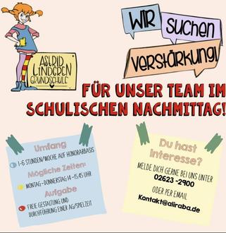 Die Astrid-Lindgren-Grundschule in Ransbach-Baumbach ist eine Ganztagsschule in Angebotsform. Um den Kindern ein attraktives und vielfältiges Ganztagsangebot zu bieten, sind wir ständig auf der Suche nach motivierten Mitarbeiterinnen und Mitarbeitern auf Honorarbasis. Möglich sind 1-6 Stunden in der Woche. Diese Stunden liegen Montag-Donnerstag von 14 Uhr bis 15.45 Uhr. Materialien und Ideen sind vorhanden. Sollten Sie Interesse haben, an unserer Ganztagsschule ein wöchentliches Projekt/ eine Arbeitsgemeinschaft (z.B. Schulhofspiele, Gesellschaftsspiele, Brettspiele, Bewegungsspiele, malen, basteln, singen, tanzen, turnen, häkeln, stricken, ...) anzubieten und unsere Schülerinnen und Schüler zu betreuen, melden Sie sich bitte unter kontakt@aliraba.de