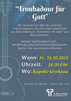 | 16:30 Uhr | Troubadour für Gott - zusammen singen und beten in der Kapelle Grenzau |