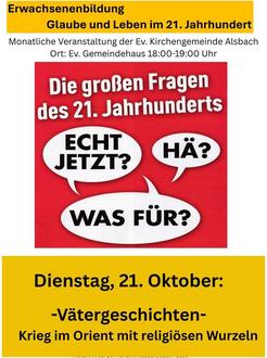 | 18:00 Uhr | Erwachsenenbildung: „Vätergeschichten - oder: Warum die sich im Orient immer auf die Mütze hauen müssen?“ |