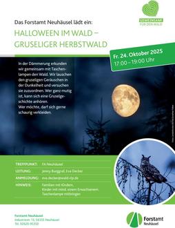 In der Dämmerung wollen wir gemeinsam mit Taschenlampen den Wald erkunden. Wir lauschen den gruseligen Geräuschen in der Dunkelheit und versuchen sie zuzuordnen. Wer ganz mutig ist, kann sich auch noch eine Gruselgeschichte anhören. Gerne schaurig verkleidet, das ist aber natürlich kein Muss! Kinder müssen von mindestens einem Erwachsenen begleitet werden. Denken Sie bitte an wetterangepasste Kleidung/Schuhe und eine Taschenlampe. Die Veranstaltung ist kostenfrei.
