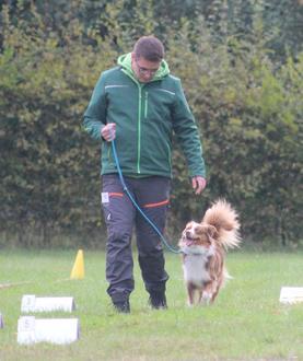 Die Premiere stand für Nico Leicher mit seinem Mini Australian Shepherd „Monte“ an. Zum allerersten Mal starteten die Zwei bei einem Hundsportturnier. Die Nervosität für die Klasse Beginner wurde direkt im Vorbereitungsbereich abgelegt. Das war auch gut so, denn Monte fand den Platz auf dem er noch nie war so spannend, dass erst mal die Nase schnüffelnd am Boden hing. Doch N. Leicher behielt die Nerven, führte seinen Vierbeiner souverän durch den Pacrours. Das begriff auch Monte schon mit den ersten Metern und folgte prompt seinem Hundeführer im Gleichschritt hoch konzentriert und motiviert. Auch im Hundesport ist noch kein Meister vom Himmel gefallen. So kam zwischendurch ein Doppelkommando was zu 5 Punkten Abzug führte. Dafür absolvierte Monte die Schildübung „Links Drehung“ besser als je zuvor im Training. Für die Leistung gab es sensationelle 93 Punkte, Platz 7 und direkt im ersten Durchgang die Qualifikation für Klasse 1. Für das erste Turnier eine tolle Leistung. Gerne mehr davon!
