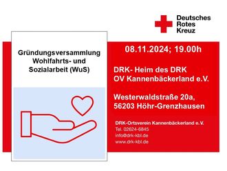 Einladung zur Gründungsversammlung der DRK Gemeinschaft Wohlfahrts- und Sozialarbeit (WuS) im DRK-OV Kannenbäckerland e.V. am 08.11.2024 ab 19:00 Uhr, im DRK-Heim, Westerwaldstraße 20a, 56203 Höhr-Grenzhausen