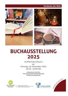 Am Sonntag, 16.11.2025 ist es wieder soweit, das Team der Bücherei in Nauort lädt Sie herzlich zu seiner jährlichen Buchausstellung im Pfarrheim Nauort ein. Von 10:30 Uhr - 18:00 Uhr erwartet Sie eine große Auswahl an Büchern verschiedener Genres und für alle Altersklassen. Kalender, CDs oder Tonies ergänzen die Auswahl. Außerdem erwarten Sie noch weitere Aktionen. So öffnen wir wieder unser beliebtes Antiquariat, wo Sie sich gegen eine kleine Spende mit reichlich Lesematerial eindecken können. Nachmittags verwöhnen wir Sie, zu kleinen Preisen, mit frischem Kaffee und selbstgebackenem Kuchen in unserer Cafeteria. Wir gedenken dem 150. Geburtstag von Thomas Mann mit einer kleinen, ihm gewidmeten, Ecke und wir freuen uns, dass in diesem Jahr Frau Heidemarie Edelmann ihre selbstgestalteten Schmuck- und Dekoideen sowie Taschen anbietet. Kommen Sie vorbei, stöbern Sie durch unser breites Angebot und vielleicht finden Sie sogar schon das erste Weihnachtsgeschenk. Ihre Bestellungen unterstützen unsere Arbeit, da wir die kleine Provision, die wir dafür erhalten, in neue Medien investieren und somit unseren Bestand für Sie interessant und aktuell halten können. Wir freuen uns auf zahlreiche Besucher, besonders auch auf viele Neugierige, die unsere Bücherei bisher noch nicht kennen.