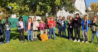 So stand am vergangenen Freitag „Apfelernte“ auf dem Stundenplan unserer Klasse 3a. Mit Apfelpflückern, per Hand und rüttelnd holten wir die Früchte vom Baum und sammelten sie in einem Sack. Alle machten mit und jeder hatte alle Hände voll zu tun. Einige Äpfel genossen wir direkt. Dazu schälten wir sie mit Frau Thiesens Apfelschälmaschine. Diese machte das Obst zu einer Spirale. So schmeckten die Äpfel gleich noch besser. Frau Thiesen ließ den Rest der Ernte bei einer mobilen Apfelpresse zu Saft verarbeiten. So konnten wir am Montag im Erzählkreis frisch gepressten Apfelsaft genießen. „Das schmeckt, als ob man in einen Apfel beißt“ hieß es und im Nu war der Saft leer. „Das können wir nächstes Jahr wieder machen“. Die Klasse wünscht sich nun jede Woche einen Apfeltag mit Spiralapfel und Schalen als Apfelspaghetti.