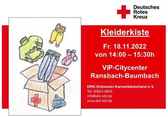 Am 18. November 2022 haben wir in der Zeit von 14:00 - 15:30 Uhr wieder für Sie geöffnet. Unsere Kleiderkiste befindet sich im VIP-Citycenter (Rheinstraße 96, neben der Ausgabestelle der Tafel) in Ransbach-Baumbach.