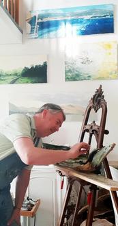 Er hält inne, betrachtet sich das Holz und läßt seiner Fantasie freien Lauf: wie sieht das Objekt aus, welche Konturen, Strukturen, Farbnuancen sind zu erkennen, was könnte aus diesem Holz entstehen? Mit diesen Gedanken begann Herr Panfilov auch seine Präsentation vor den Bewohnern im „Haus am Erlenhofsee„. Die anwesenden Bewohner waren voll konzentriert und lauschten aufmerksam seinen Erklärungen. Dabei wurden sie immer wieder zu eigenen Gedanken, Vorstellungen und Fantasien animiert. Was zunächst nur wie ein bemaltes Stück Holz aussah, entwickelte sich im Gespräch plötzlich in eine Rheinlandschaft, die ein Schiff durchfuhr, oder man erkannte förmlich die imposante Mittelgebirgslandschaft des Siebengebirges. Bei einem anderen Stück glaubten sie einen Fisch zu erkennen, der je nach Betrachtung ein breites Maul oder einen schmalen Kopf als besonderes Merkmal hatte. Auch an einem noch unbehandelten Holz tobte sich die Vorstellungskraft aus. Man konnte meinen, der eine oder die andere würde sich bald ebenso dem Treibgut malen zu wenden und sich wie Herr Panfilov ( Bild Treibgut 2 ) in der Freizeit nur noch vor der Staffelei zu finden sein.