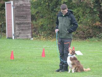 Es war nicht sonderlich kalt an diesem Tag, aber es regnete ordentlich, als die zwei ihren Parcours abgingen. Dementsprechend nass war die Wiese. Trotzdem klappte selbst der „Vorsitz“ auf der nassen Wiese einwandfrei. Was mit scheinbar abgelenktem Hund begann, entpuppte sich zum Ende hin zu einem starken Team mit klar umgesetzter Kommunikation. Dafür gab es 91 Punkte, Platz 4. Für das 2. Turnier eine starke Leistung.