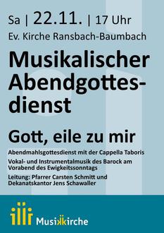 | 17:00 Uhr | Musikalischer Abendgottesdienst zum Ewigkeitssonntag in der ev. Kirche in Ransbach-Baumbach mit Pfarrer Carsten Schmitt |