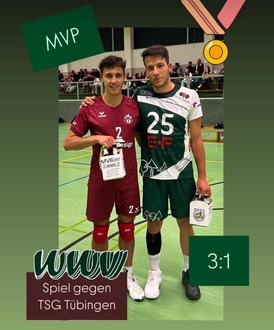In der Dritten Liga am Abend betrat dann in der Halle der Westerwald Volleys ein Gegner die Halle, der in der Tabelle nur knapp im Nachtreffen war. Die TSG Tübingen brachte nach dreistündiger Anfahrt gute Stimmung in die zahlreich besuchte Heimspielhalle. Die ersten beiden Sätze wurden durch gute Blockarbeit und durch Kampfgeist, bei besonders langen Ballwechseln, auf dem Konto der Westerwälder verbucht. Im dritten Satz wollten so einige Angriffsversuche der WWVs aber nicht so recht den Erfolg bringen und technische Fehler führten zu Diskussionen und Punkt- bzw. sogar zum Satzverlust mit 20:25 Punkten. Die richtige spielerische Angriffsstärke zeigte sich im vierten Satz, in dem auch der später gewählte MVP Peter Nogueira-Schmid auf der Diagonalposition Durchschlagskraft bewies. Mit 3:1 Sätzen gegen Tübingen sichern sich die Westerwald Volleys damit drei Tabellenpunkte und verbleiben auf dem 6. Platz.
