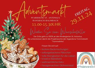 Besuchen Sie unseren Adventsmarkt am Freitag, 29.11.24 im Pfarrheim St. Antonius Ransbach-Baumbach. Zwischen 11.00-15.30 Uhr finden Sie bei uns: