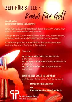 | 18:30 Uhr | Eucharistiefeier - meditativ / Amt für Walter und Heide Gerharz, Valentin und Rosina Gerharz, Walter und Johanna Ramroth sowie verstorbene Angehörige / Amt für verstorbene Priester |