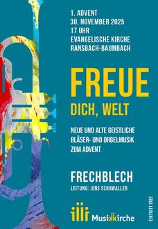 Die Musikkirche lädt am 1. Advent, 30.11. um 17 Uhr in die Musikkirche, Kirchstraße 13 in 56235 Ransbach-Baumbach zum traditionellen Adventskonzert von FRECHBLECH, dem Soloquartett des Evangelischen Dekanates Westerwald, ein. Zur Aufführung gelangen traditionelle Werke von A. Hammerschmidt und Joh. Chr. Fr. Bach, die mit modernen Kompositionen von Z. Kodály, A. Schumacher, Chr. Sprenger und A. Weckeßer, Gemeindegesang sowie Lesungen kontrastieren. Das Orgelspiel und die Leitung obliegen Dekanatskantor Jens Schawaller. Der Eintritt ist jeweils frei, nähere Informationen unter http://musikkirche.de.
