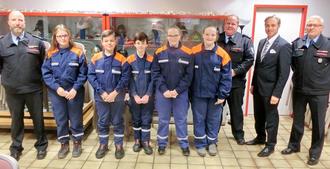 Im Rahmen der Jahresdienstversammlung wurde (von links) durch Jugendwart Arne Gotzen, stv. Wehrleiter Florian Henkes, Bürgermeister Michael Merz und Wehrführer Olaf Faller die „Jugendflamme 1“ verliehen an: Alina Milito, Alexander Tarnow, Finn Pusch sowie Lena und Hanna Wortmann.