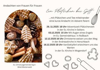 | 16.00 Uhr | Andacht von Frauen für Frauen „Zimtsterne weisen uns den Weg“, Andreasgemeinde, Herschbach |